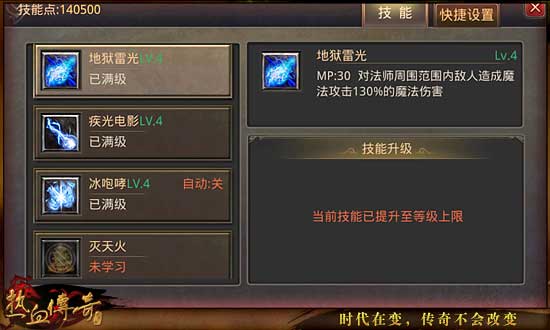 《热血传奇手机版》的法师职业,拥有着10个十分强大的技能。有单体攻击、有防御技能、也有较多的区域伤害技能。其中平时刷图优先升级地狱雷光和雷电术。满级后能够强化的技能是火墙和疾光电影,疾光电影作为PK时的技能可以重点强化。法师的两大终极技能是灭天化和流星火雨,击杀世界BOSS有几率获得。